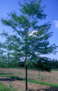 This spreading, fast growing tree is easily established. Dark green foliage casts gentle shade. Foliage persists longer in fall than on other locusts. Fall colour of pale yellow. Fallen leaves quickly disintegrate; raking rarely necessary. Prefers deep, fertile and well-drained soil with full sun. Tolerates alkaline conditions. Tolerates urban pollution and once established, will tolerate drought.