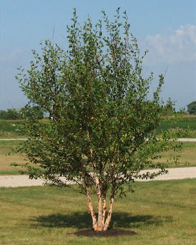 Showy, chalk white, peeling bark with black markings is attractive on this fast growing tree. Dark green foliage throughout the summer, turning yellow in the fall.