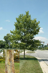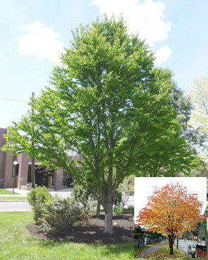 Forms a nearly perfect, pyramidal head and displays green foliage with shades of yellow, orange, and reddish-orange in the fall. Suitable for boulevard planting and confined areas.