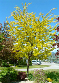 The foliage keeps its beautiful appearance all summer. Has a broad pyramidal head. Very hardy and does well in nearly all locations. Thorn-less and seedless. Bright yellow foliage can fade to more greenish in the summer. Fall colour is yellow.