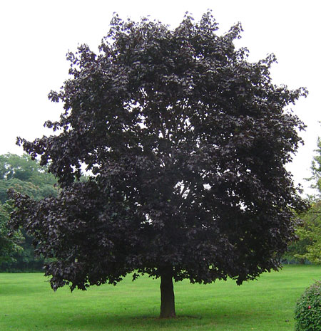 Deep maroon red foliage provides dense shade all summer. Similar to Crimson King with good cold hardiness and excellent form. It retains this colour in the fall.