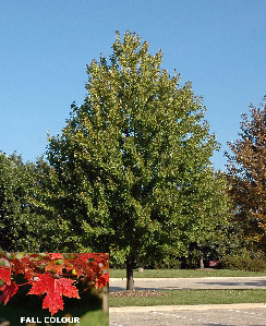 A rapid growing tree with a very symmetrical, rounded to oval crown, Thick, dark leaves are resistant to summer heat and leaf tatter. Deep red, orange and golden- yellow fall colour.